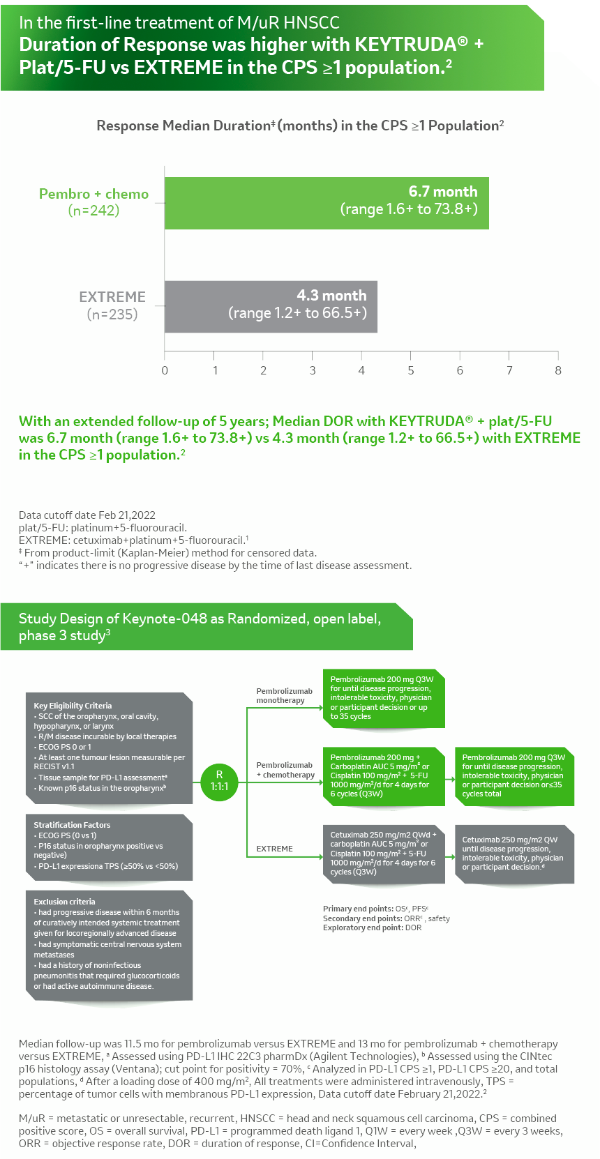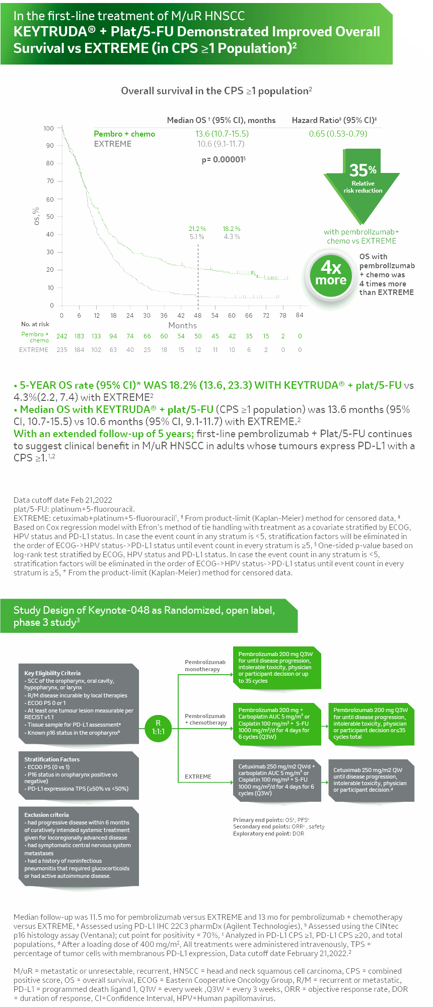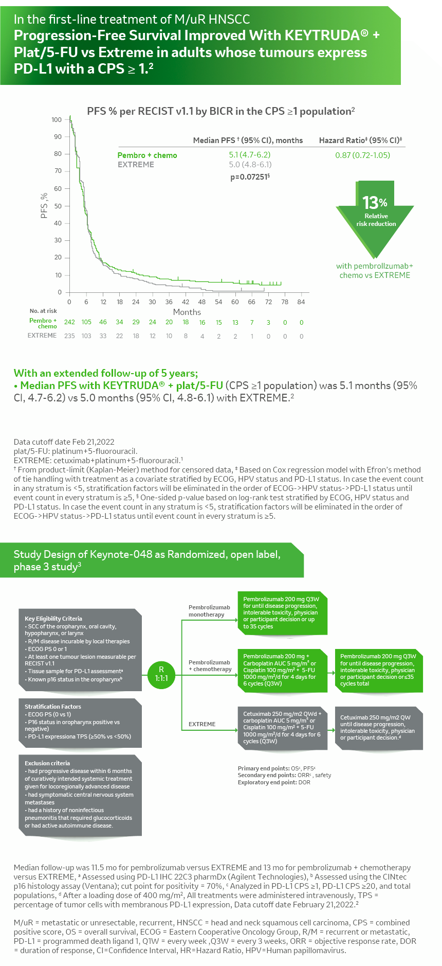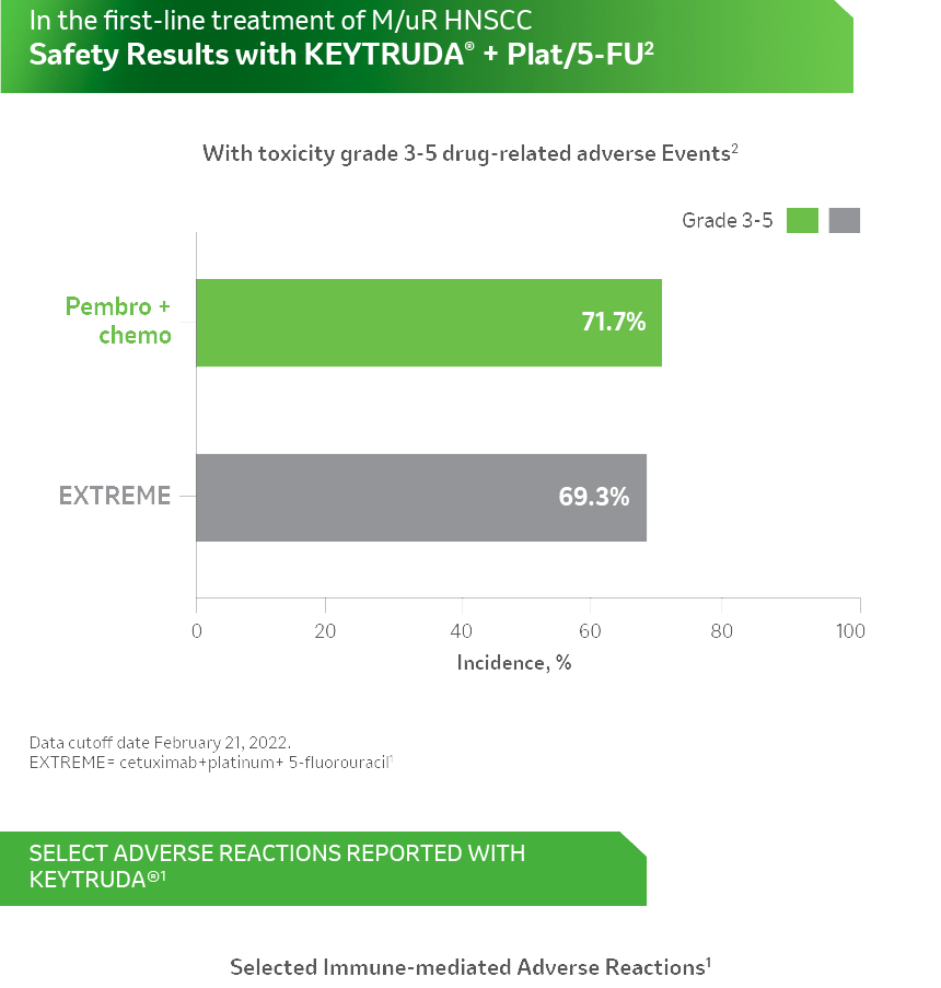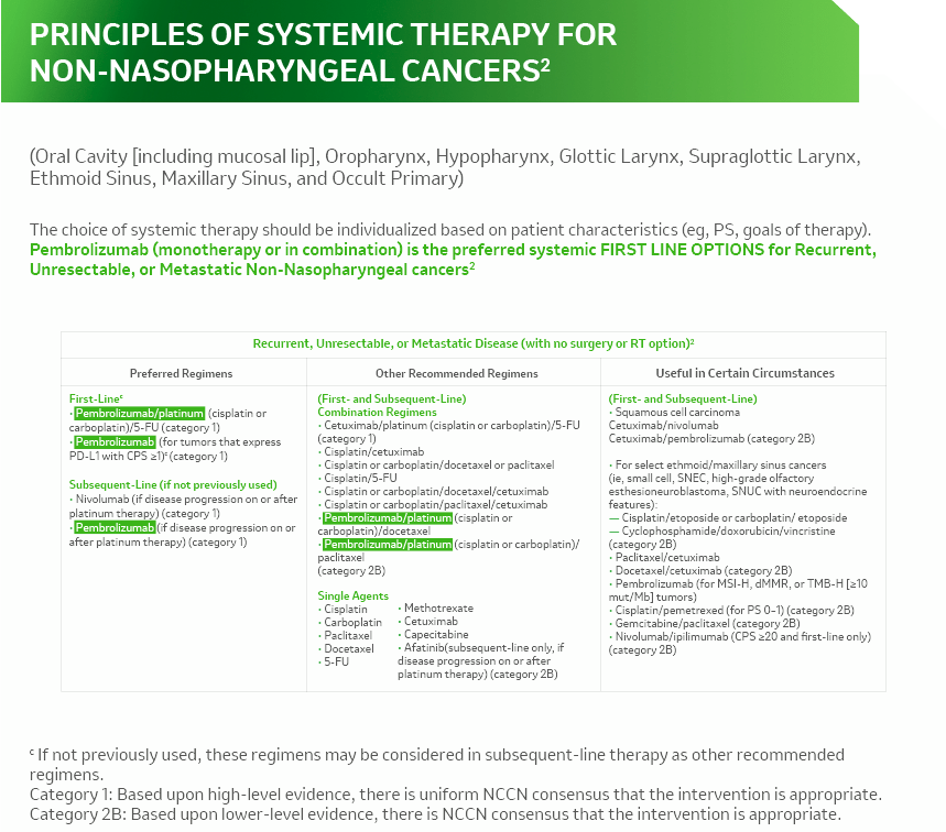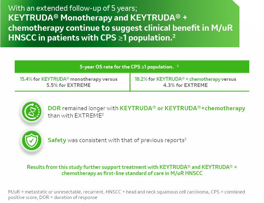 - Burtness B, Harrington KJ, Greil R, et al; KEYNOTE-048 Investigators. Pembrolizumab alone or with chemotherapy versus cetuximab with chemotherapy for recurrent or metastatic squamous cell carcinoma of the head and neck (KEYNOTE-048): a randomised, open-label, phase 3 study. Lancet. 2019 ;394(10212):1915-1928.