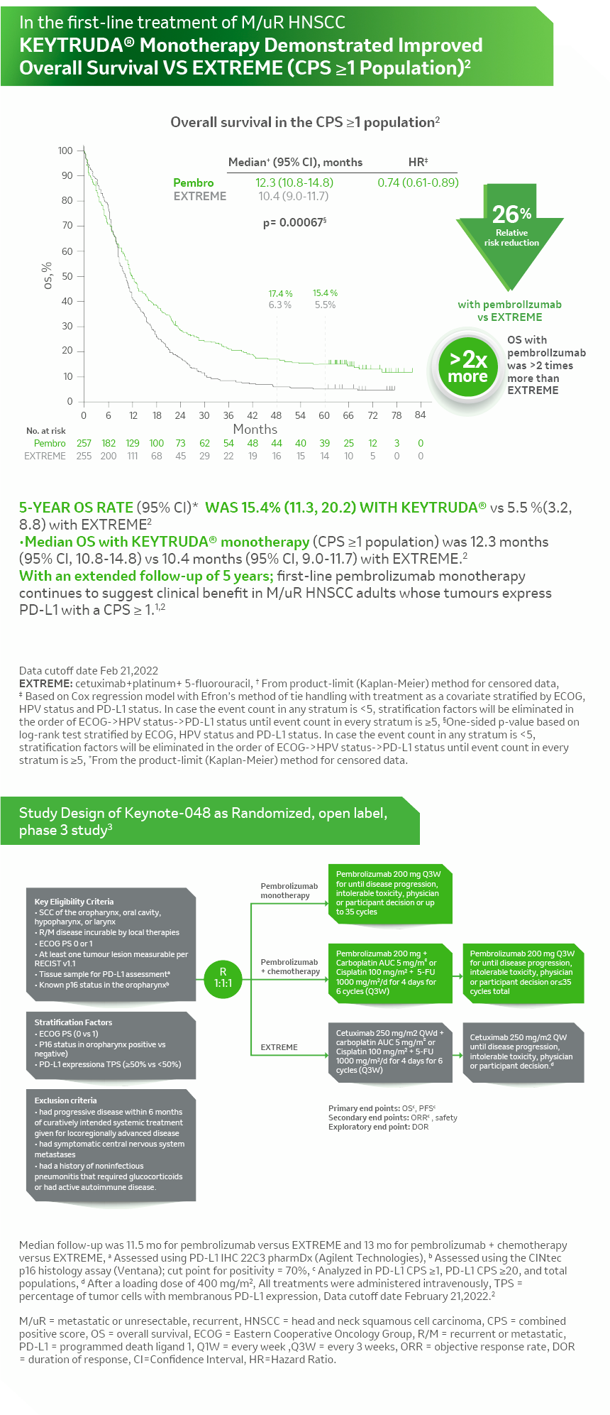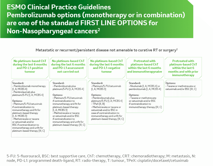 - Burtness B, Harrington KJ, Greil R, et al; KEYNOTE-048 Investigators. Pembrolizumab alone or with chemotherapy versus cetuximab with chemotherapy for recurrent or metastatic squamous cell carcinoma of the head and neck (KEYNOTE-048): a randomised, open-label, phase 3 study. Lancet. 2019 ;394(10212):1915-1928.